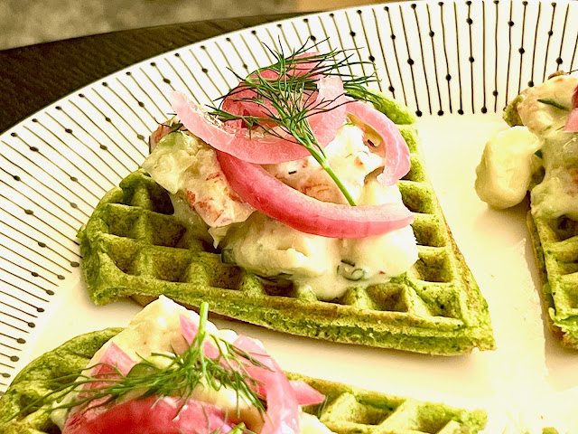 Kun kaupungissa tulee niin harvoin laitetuksi vohveleita, päätin viedä vohveliraudan mökille. Pinaattivohvelit oli kenraaliharjoitus siihen kun maasta alkaa puskea nokkosia ihan urakalla. Kaikenlaiset savukalasalaatit sopivat niin pinaattilettujen kuin pinaattivohveleidenkin kanssa. Mutta kun jääkaapissa oli purkki tarjousravunpyrstöjä tilliliemessä, niin niistä tuli tosi herkullinen sekoitus yhdessä avokadojen kanssa. Vähän pikkelöityä punasipulia viimeistelyksi, niin se oli siinä, todella maukas iltapala.